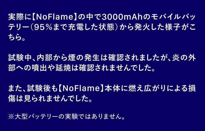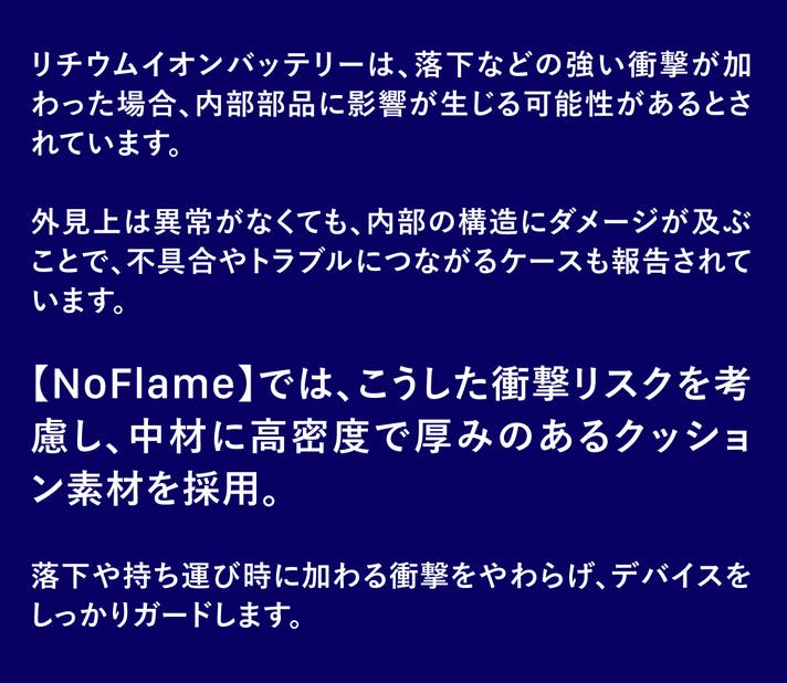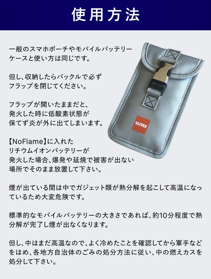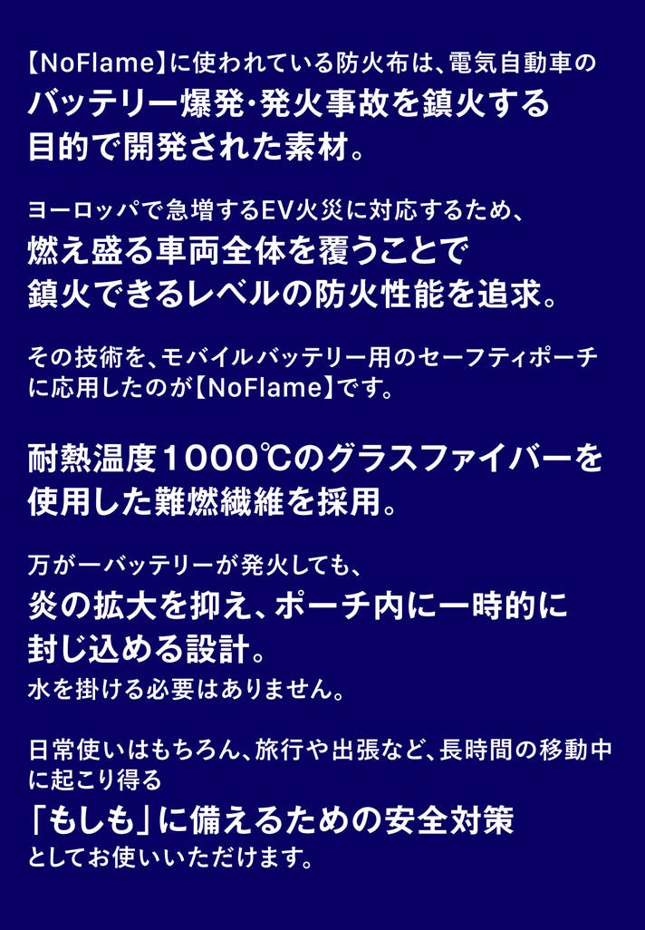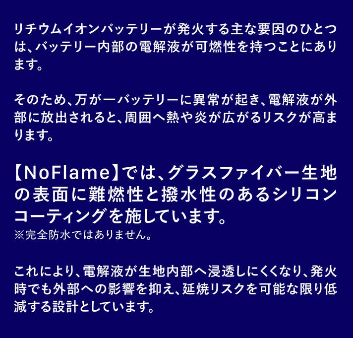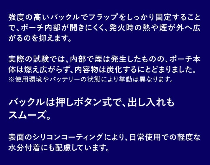 ・本製品は火災を完全に防ぐものではなく、炎や熱を一時的に封じ込め、被害を軽減するための補助用ポーチです。火災や電池の爆発による被害を完全に防止・保証するものではありません。