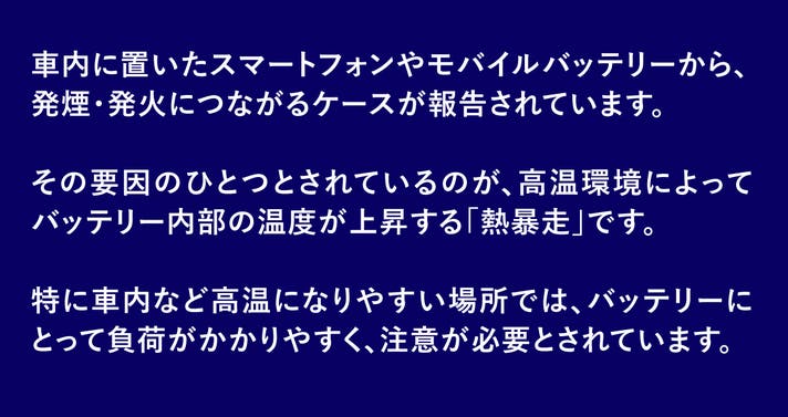 ・バッテリーに異臭や異常な熱を感じた場合は、すぐに使用を中止し、屋外の安全な場所に移動してください。