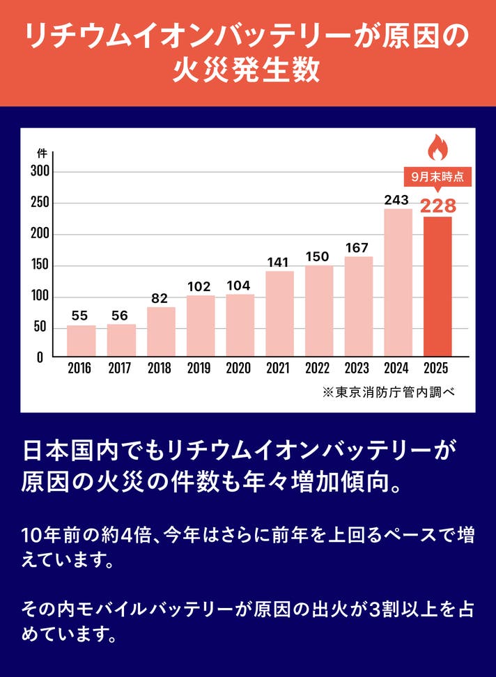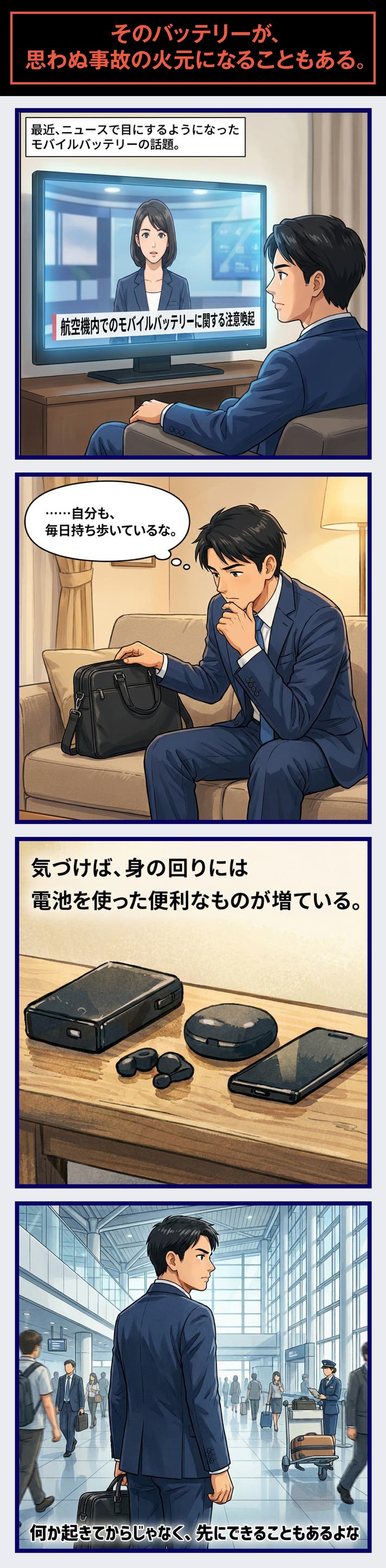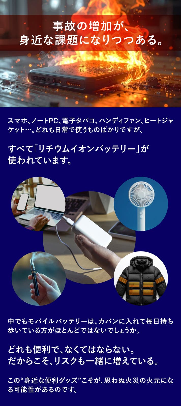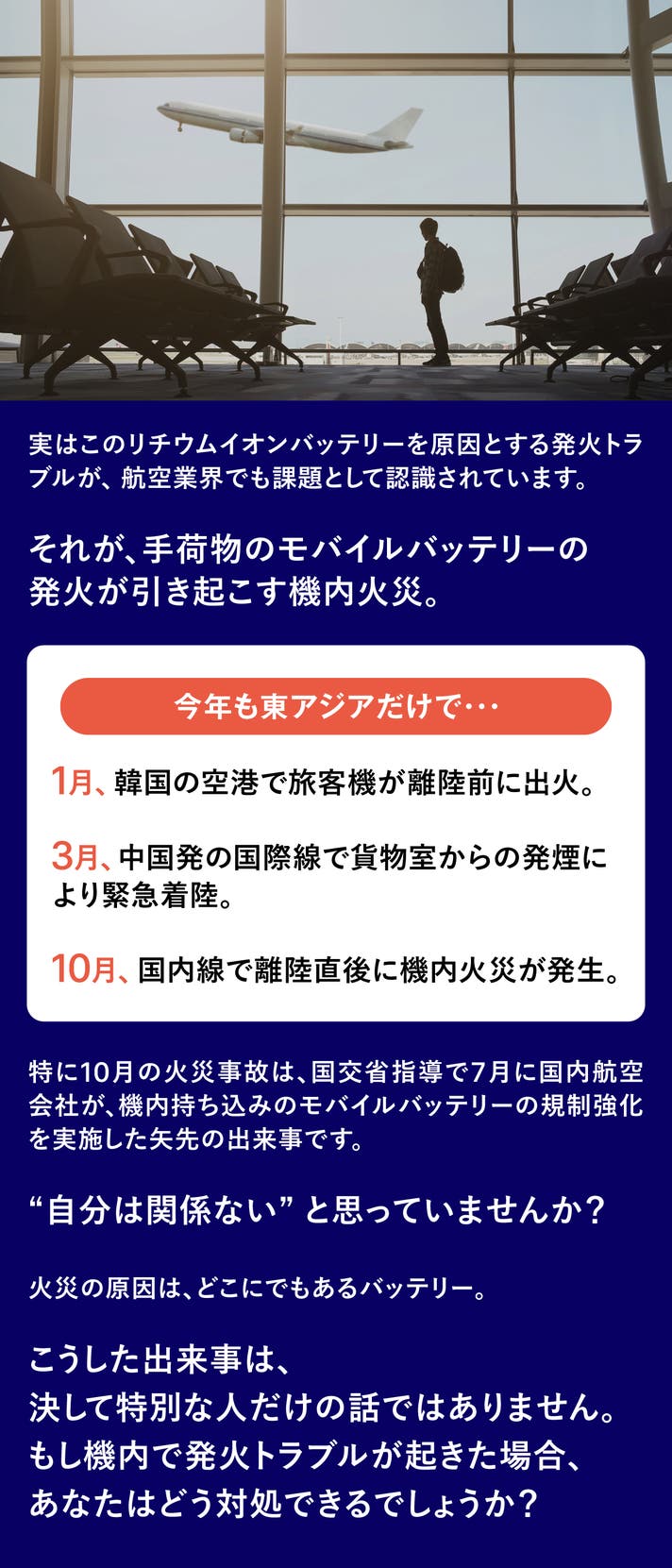 しかし、リチウム電池には発火のリスクがあり、特に出張や移動の多い方には備えが重要です。