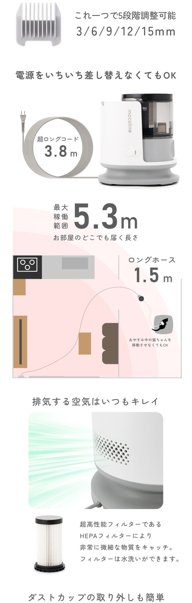 - ロングコードなので稼働範囲が広く取り回しがしやすい!ペットをわざわざ移動させなくてもいい!