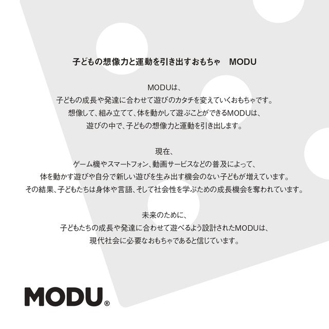 この度ご紹介させていただくMODUは、「子どもの想像力と運動を引き出す、お家で楽しめるデンマーク発の新しい知育おもちゃ」です。コロナ禍のためお外で思いっきり遊べないこと子どもや、遊びがゲームに偏ってしまっている子どもが、「頭と身体をバランスよく使って楽しめる、画期的なおもちゃ」です。是非、MODUでいっぱい遊んでいただければと思います。