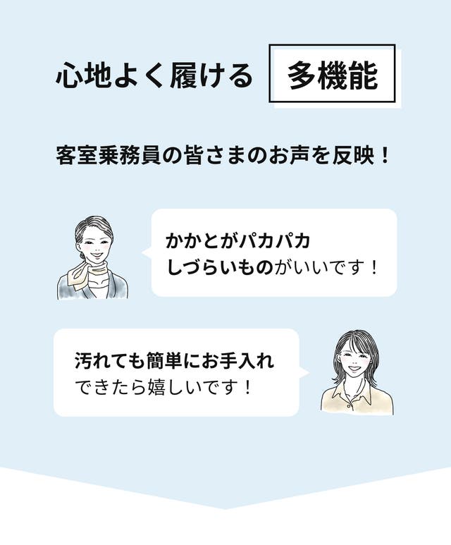 - 【現場CAの意見を反映】①パカパカ防止のかかとクッション ②お手入れ簡単 撥水加工 ③抗菌防臭
