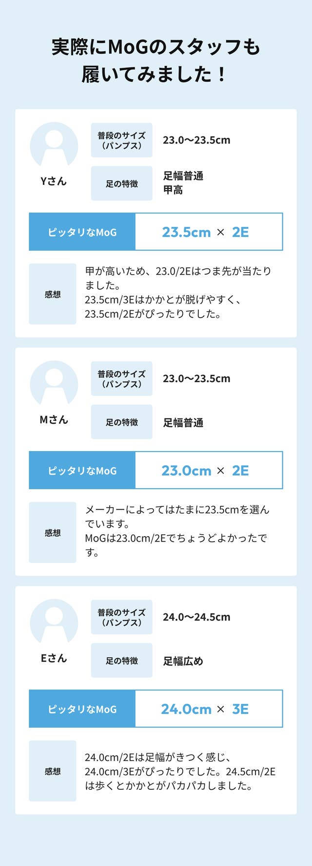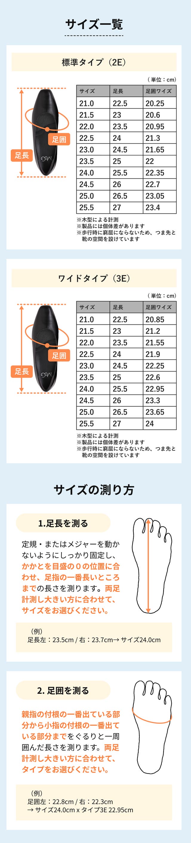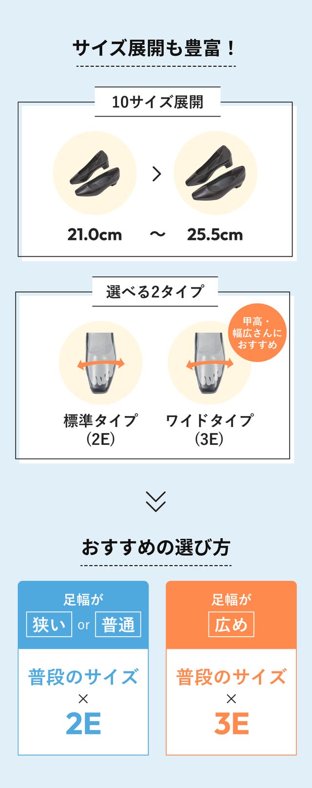 A:【足幅が小さい / 普通】場合は、【普段履いているパンプスのサイズ×標準タイプ(2E)】をお選びください。また【足幅が大きい】の場合は、【普段履いているパンプスのサイズ×幅広タイプ(3E)】をお選びください。