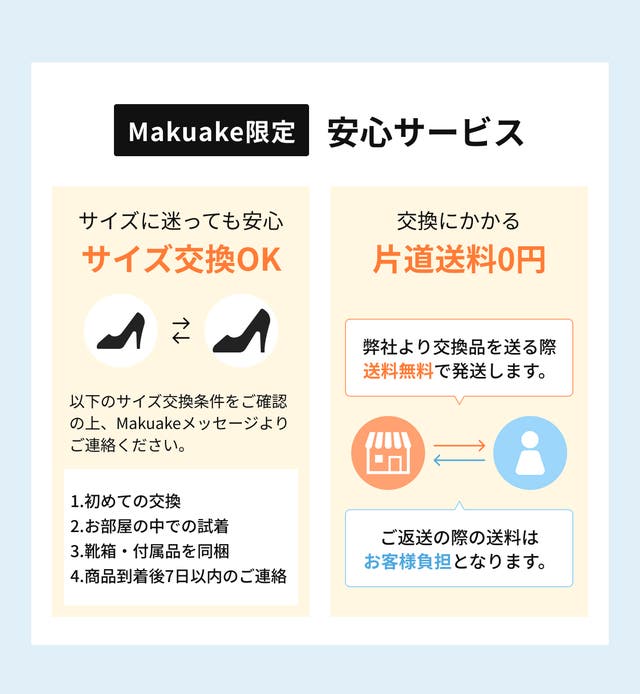 A:可能です。足の健康のためピッタリなパンプスを履いていただきたく、交換サービスを行っております。以下のサイズ交換条件をご確認の上、Makuakeメッセージよりご連絡ください。ご返送の際の送料はお客様負担(元払い)となりますので、ご了承ください。
