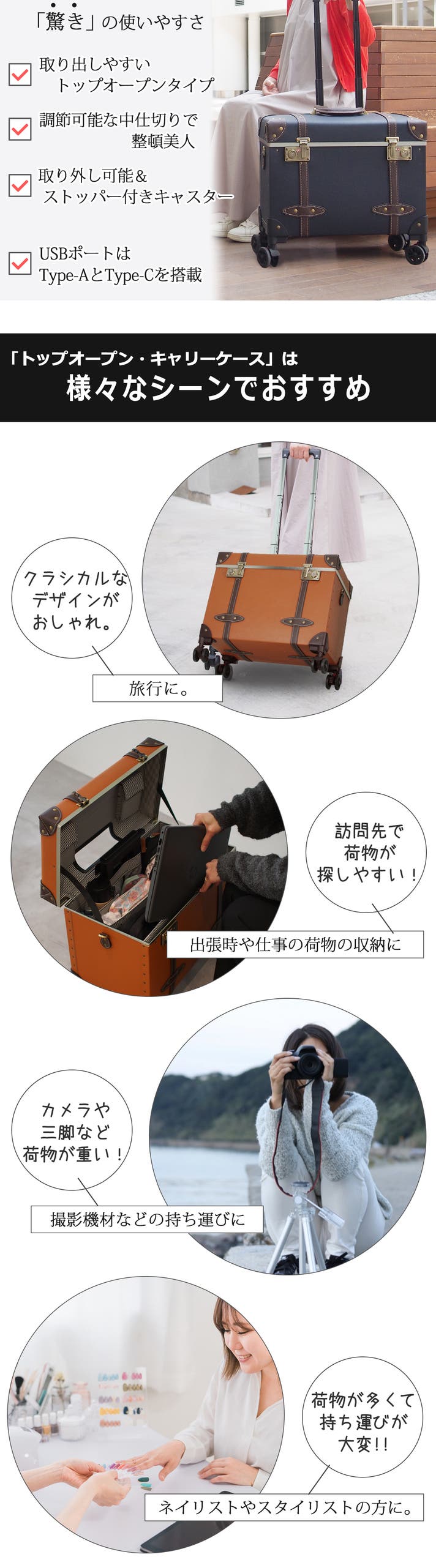 スーツケースを立てたまま、出し入れ可能。トップオープンなら、様々なシーンで荷物をスマートに取り出せます。