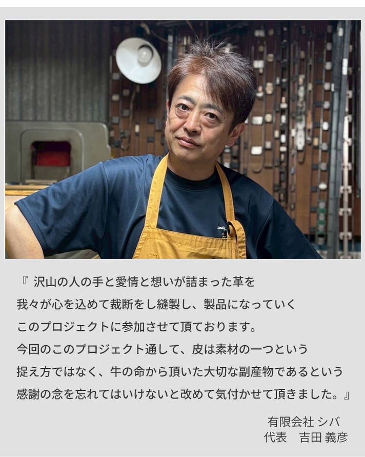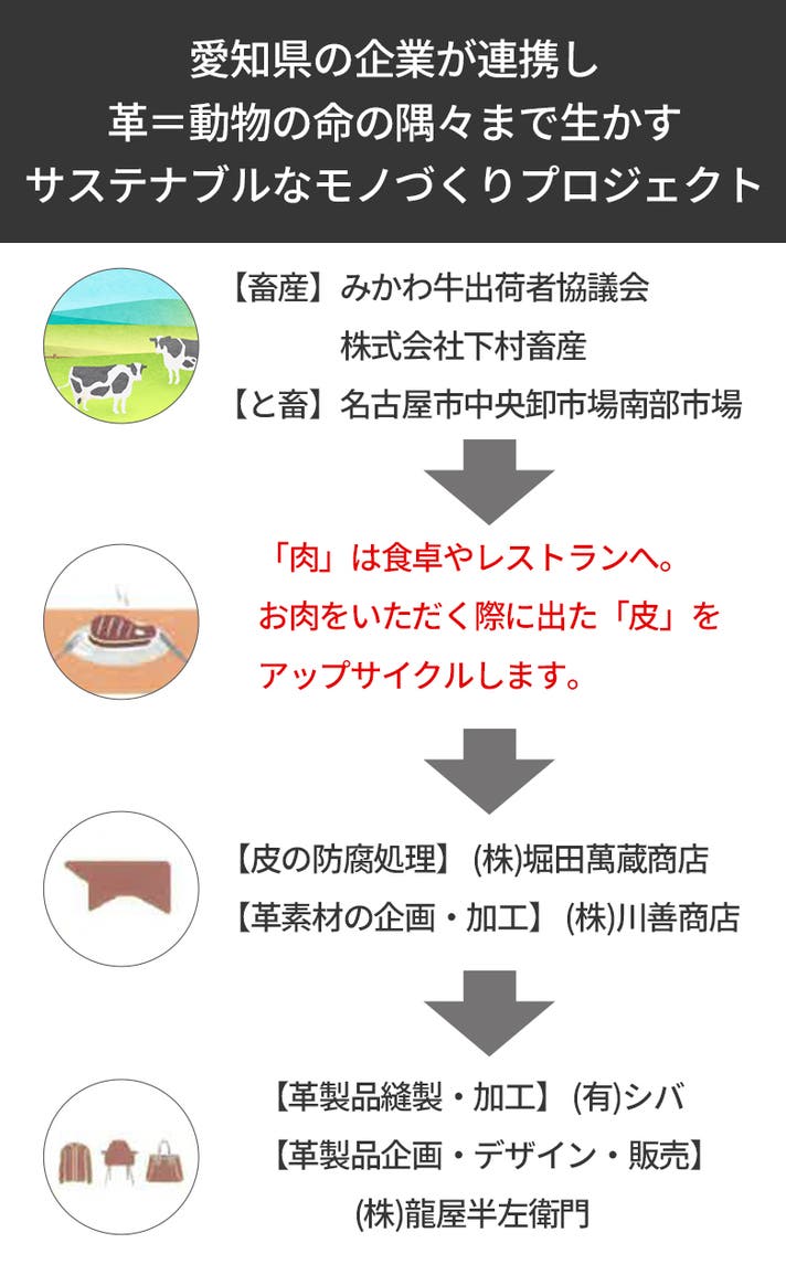 今回のプロジェクトでは、愛知県を代表する黒毛和牛"みかわ牛"の皮を使用します。豊かな自然の中で大切に育てられた”みかわ牛”。このお肉をいただく際にでる「皮」。この「皮」は使用しなければ廃棄することになります。食肉の副産物である「皮」を「革製品」としてアップサイクルし、無駄なく活かすことで、