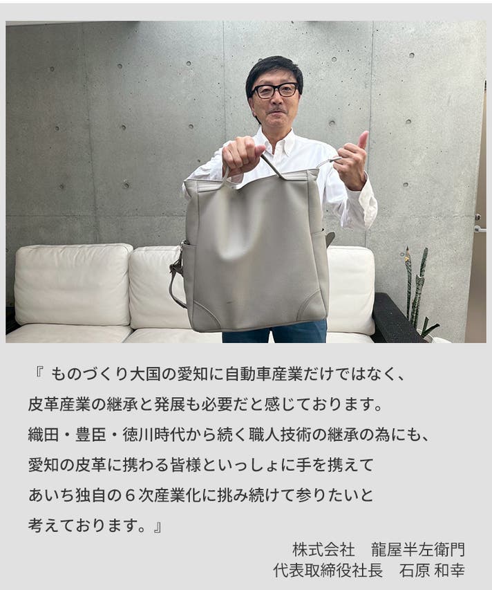 しかしこのバッグは、牛の飼育から、皮の加工~革の企画、縫製に至るまで、すべて愛知県下の企業で完結。