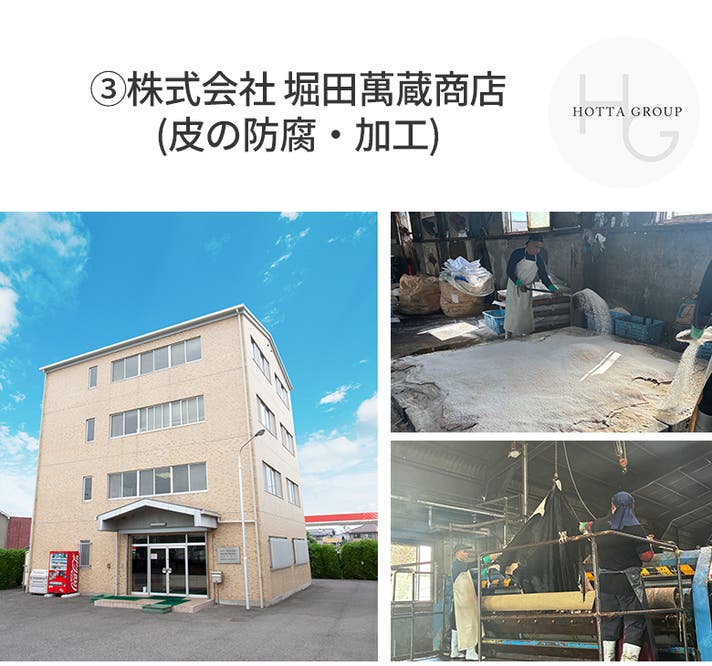 「なめし」「染色」と呼ばれる工程等を経て、丈夫で美しい「革」へと生まれ変わります。※工程の一部は兵庫県となります。