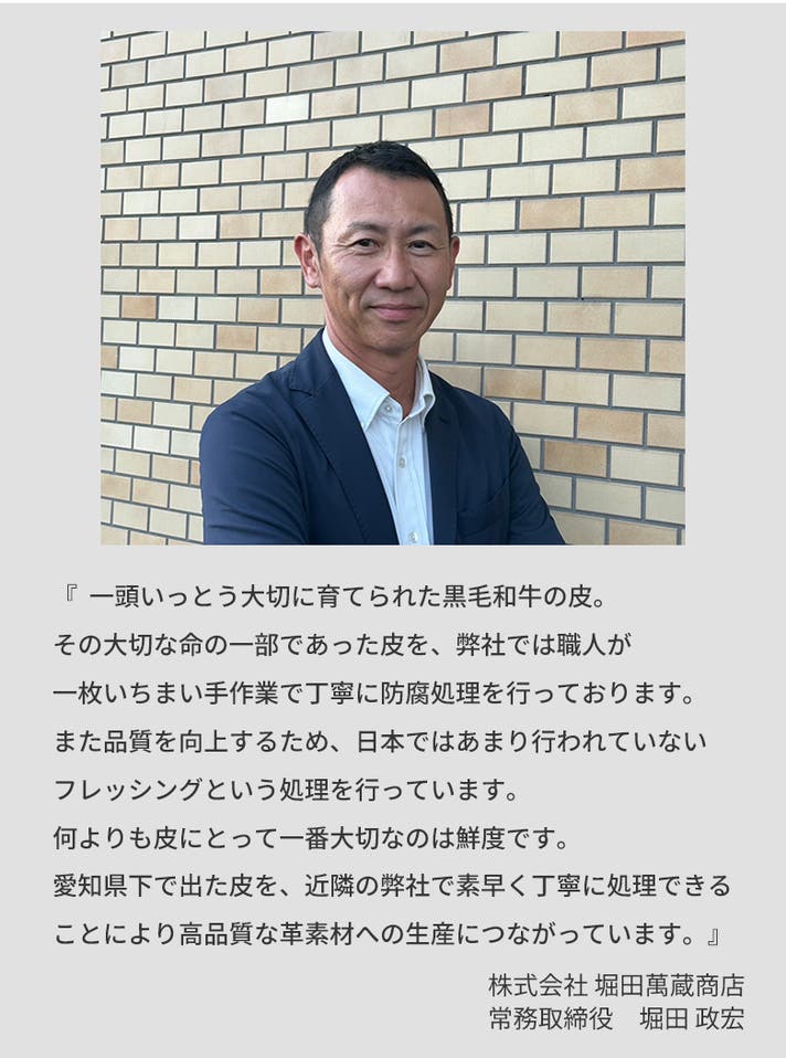 愛知県で育てられる黒毛和牛のみかわ牛は、わずか約2,500頭しか存在しません。 その限られた命から生まれる革には、一頭いっとうに深い想いが込められています。 だからこそ、私たちは大切に受け継ぎ、永く愛される製品へと創り上げていきます。