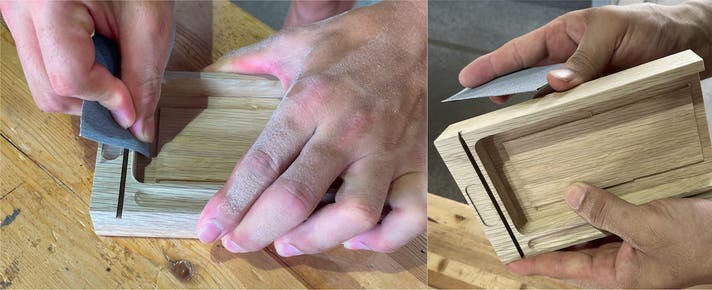 触れた時に、ささくれや角でケガをしたり、痛くないように。それでいて角がダレて、形状を損なわないように。ペーパーの番手を変えながら、熟練職人がひとつひとつ丁寧に仕上げます。