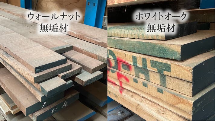 一般的にはあまり知られていないのですが、一口にウォールナット、ホワイトオークと言っても、比較的安価な集成材(端材を集めて接着剤で繋げている)が使われている場合も多く、無垢材と集成材の一番大きな違いは「木目の美しさ」にあります。