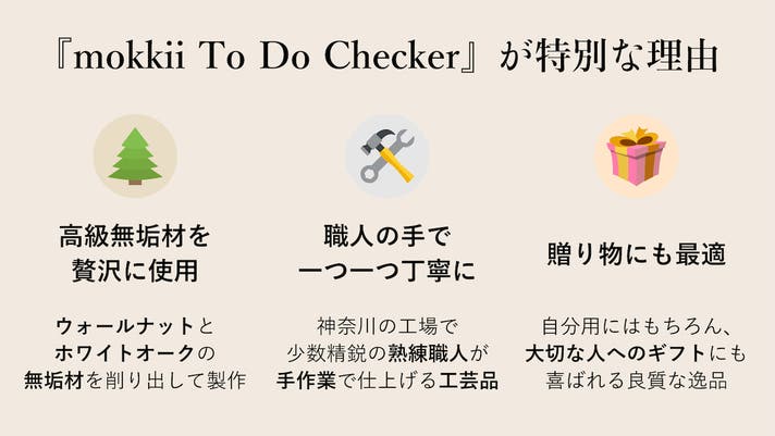 シンプルに見える『mokkii To Do Checker』ですが、私たちのプロダクト製作にかける想い、そして木のプロとしての技術とこだわりを精一杯詰め込みました。