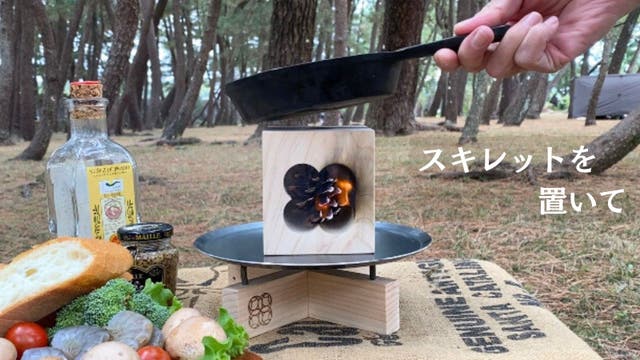 天然の着火剤といわれる松ぼっくりに火をつけて、上部の切り込みに向かって炎が上がったらスキレットを置いて調理を。ステーキやアヒージョなど料理を楽しめます。