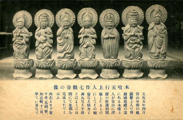 木喰は廻国修行の旅で多くの子どもたちと接していたのか、彼らの健やかな成長を祈る子安観音菩薩像や子安地蔵菩薩像を多く制作しました。中でも、木喰91歳の作で山梨県甲府市の教安寺(写真上)にあった七観音像(写真下:「木喰五行上人作 七観音絵葉書 甲府 教安寺」 『峡陽文庫』提供)の子安観音菩薩像(写真右端)は”生涯最後に彫った”仏像の可能性があります。