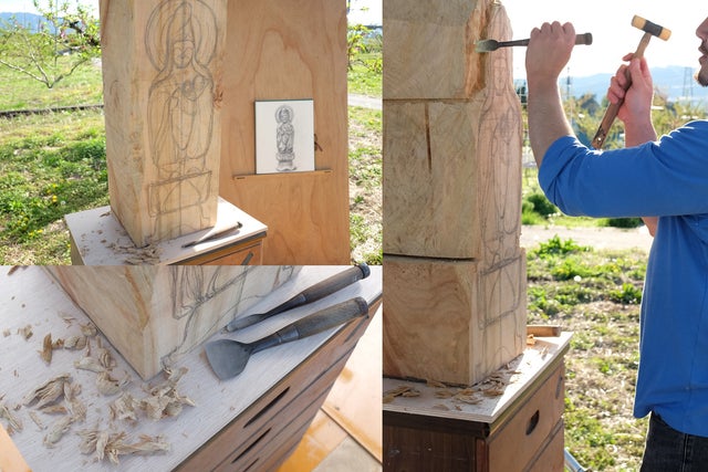 ちなみに、岡本さんは山梨特産のモモ農家でもあり、再現プロジェクトの子安観音菩薩像はモモ畑をアトリエにして生まれます。