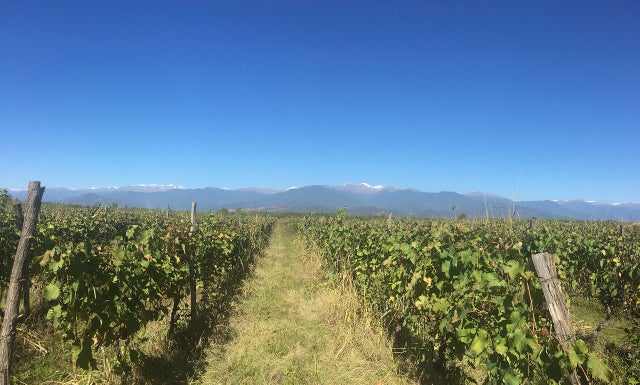 モルドバが上の写真の様な比較的標高の穏やかな波状丘陵地が多いのに対し、ジョージアは北側に最大5000m級の標高に上る大コーカサス山脈があり、ロシアからの冷たい北風から守られ比較的温暖な気候です。また、南側には小コーカサス山脈があり熱気や乾燥から守られています。