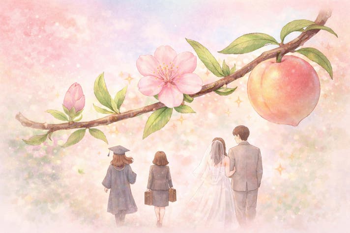 桃の花が咲き、やがて実を結ぶように。