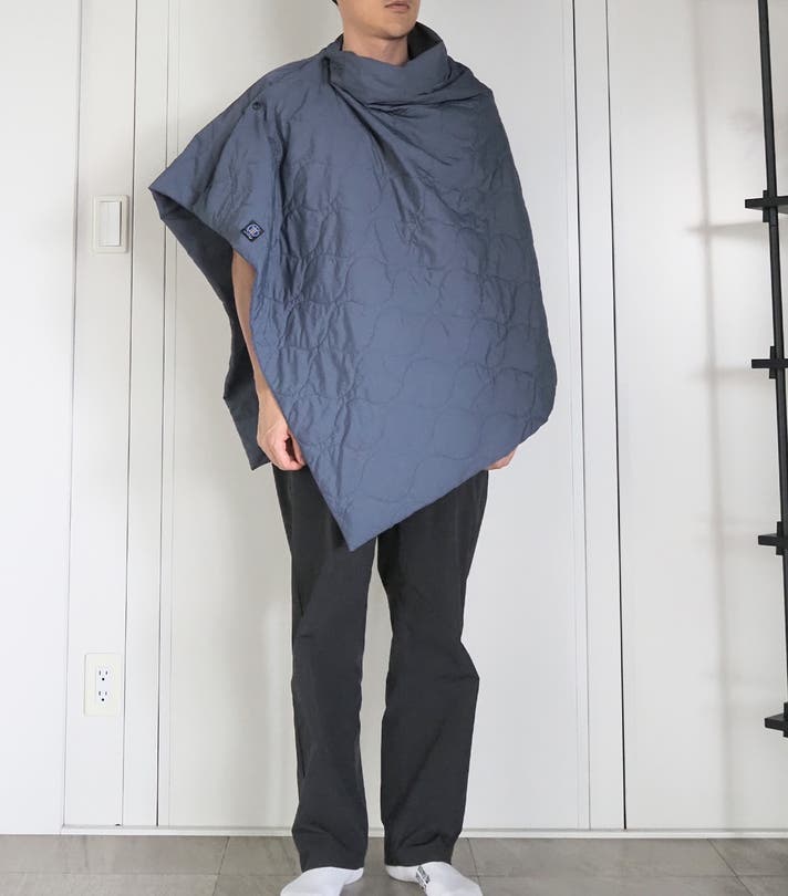 スナップ釦でポンチョのように前を留めて着ることができます。斜めにしてメキシカンポンチョのように着ると背の高い人でもすっぽりと上半身を覆うことができます。腰に巻いても使えます。