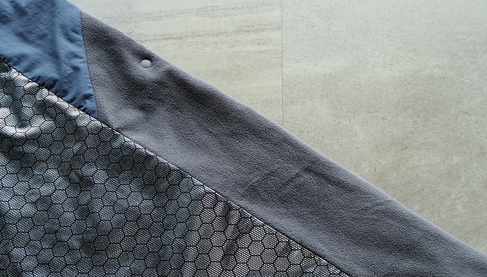 第2弾では表生地にポリエステルコードの入ったソフトナイロンを採用しています。軽量でしなやかながら強度に優れ、凹凸のある構造が肌への接着を減らしサラリとした触り心地です。
