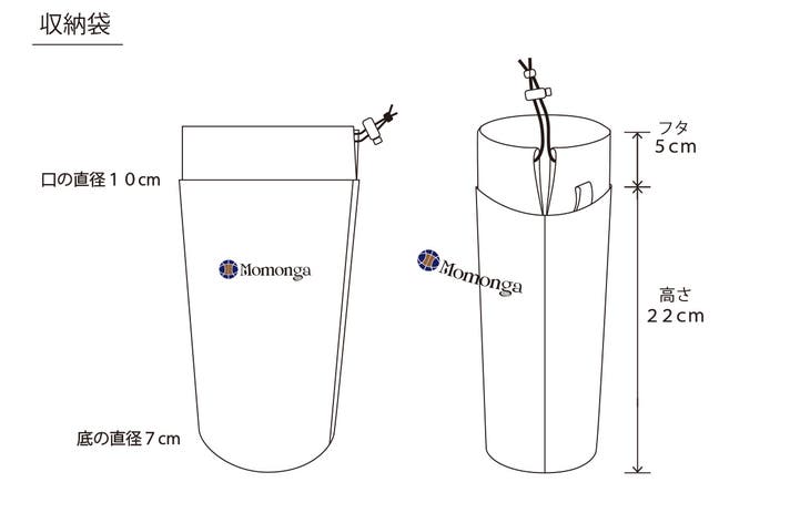 収納袋の口の直径を1cm広げて10cmにし、収納しやすくなりました。底の直径7cm、高さ22cm、フタ5cm。リュックのペットボトルポケットに入れて持ち歩きできます。