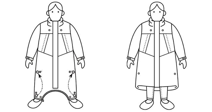 封筒型寝袋から着想したモモンガはロングスカートでもスーツでもそのまま上から重ねて簡単に着用できます。