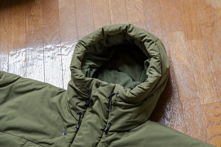 内側に中綿入りスタンドカラーの二重襟で保温性を高めています。
