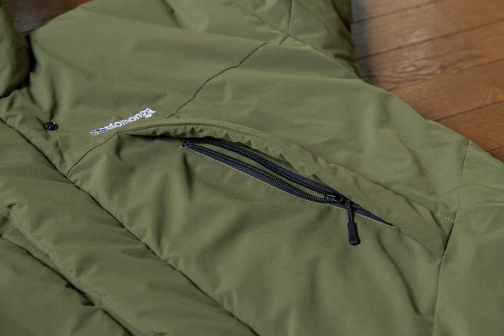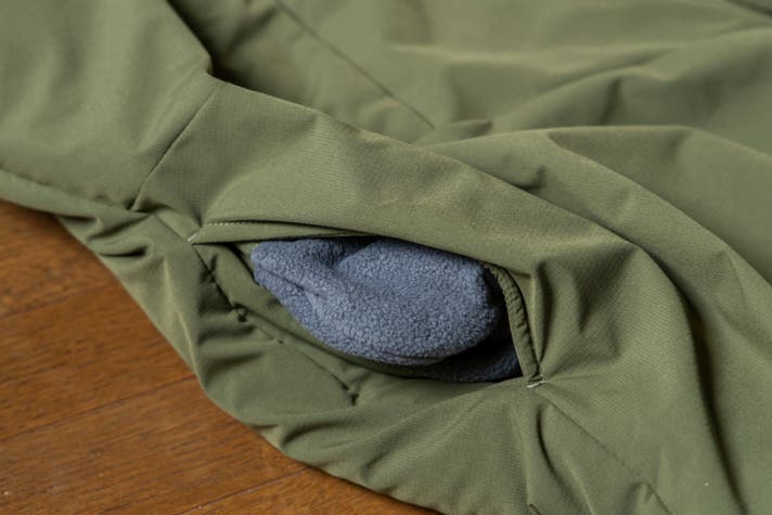 大事なものを収納するファスナーポケットと、手指を温める袋布がフリース素材のボトムポケットを備えています。
