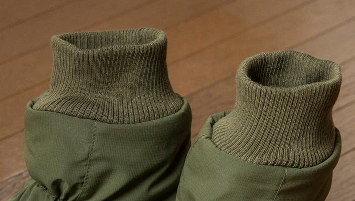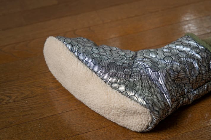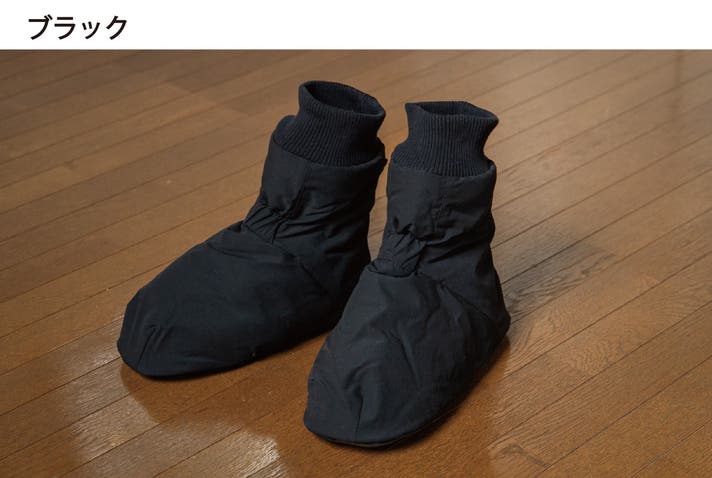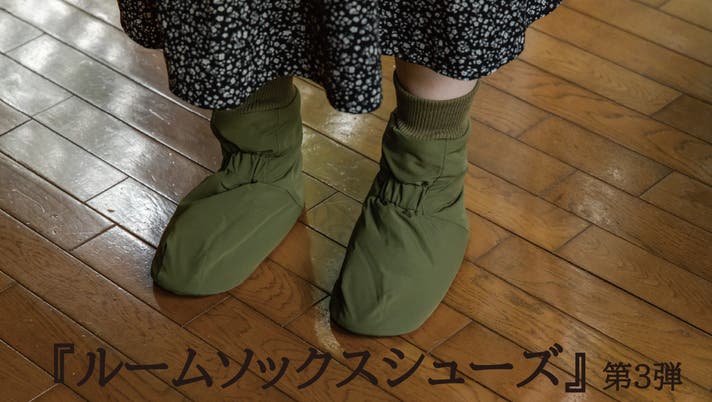 アウトドアではテントの中で足先を暖めるテントシューズが一般的ですが、もっと楽に履けるよう靴下風のデザインになっています。モモンガと同じ5層構造で、中綿はサーモライト中綿、裏地は保温裏地を使っています。内底はボアで暖かく、外底はフェイクレザーで滑りにくくなっています。(外履き用ではありません。テント内や室内でご使用ください。)