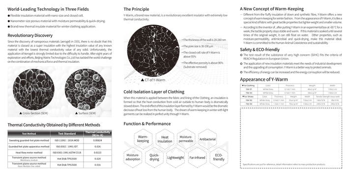 Y-warmは「透湿&速乾」機能を兼ね備えたナノ多孔質断熱・保温材料です。極めて低い熱伝導率を持ち、強力な断熱と保温性能を備えています。