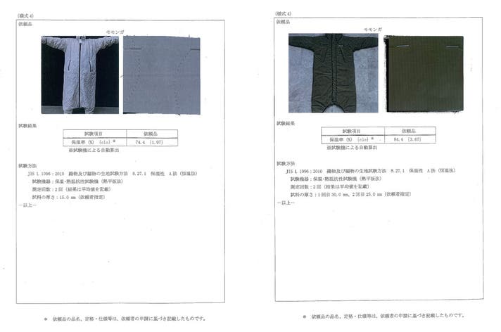 JIS L 1096 A法(恒温法)の保温性検査で弊社比較品より約118%保温性の向上が確認されました。