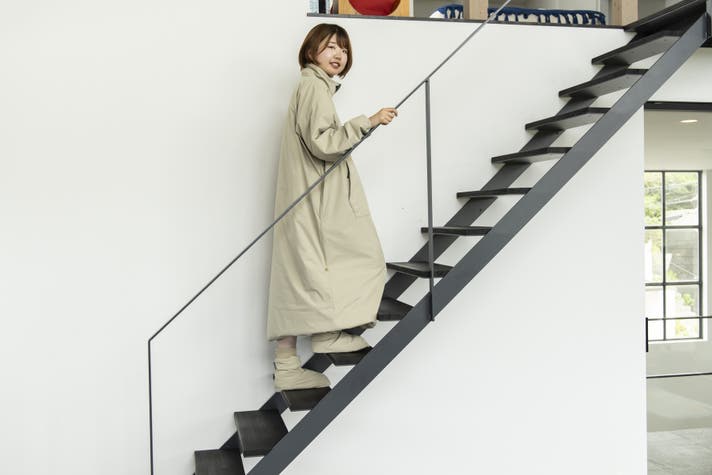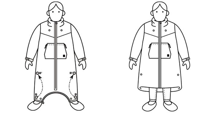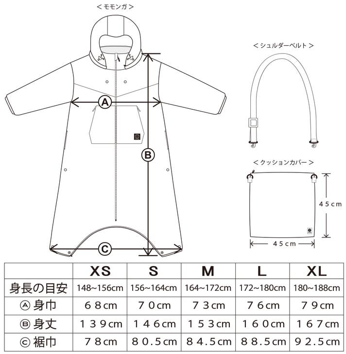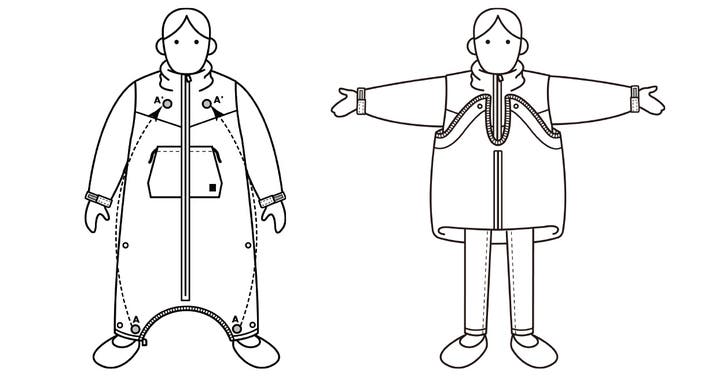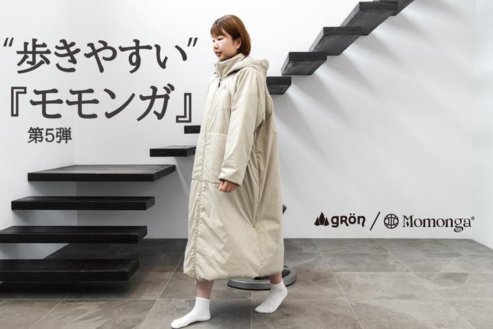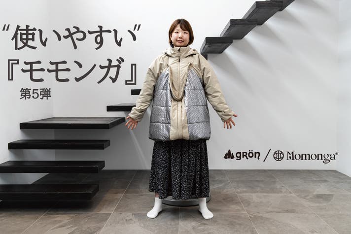 封筒型寝袋から着想したモモンガはロングスカートでもスーツでもそのまま上から重ねて簡単に着用できます。