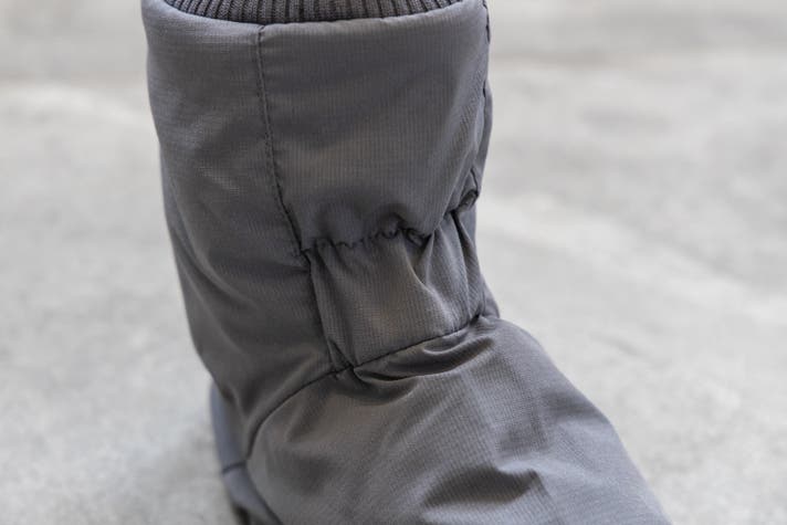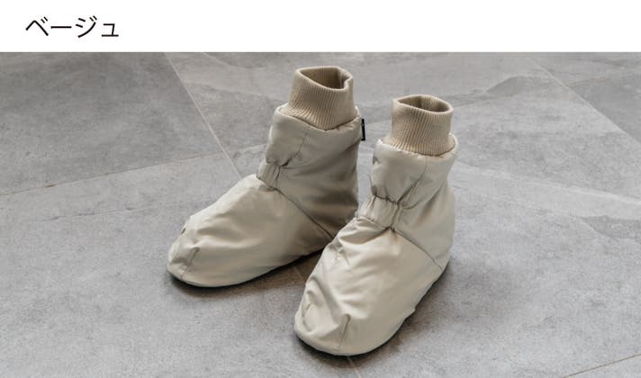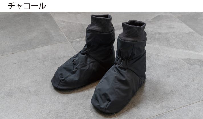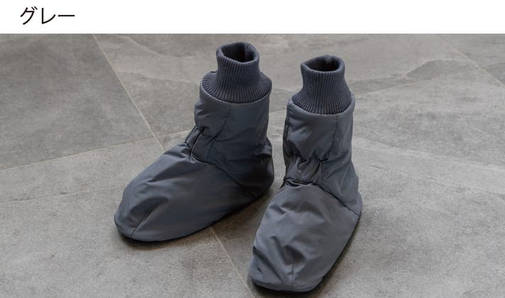 アウトドアではテントの中で足先を暖めるテントシューズが一般的ですが、もっと楽に履けるよう靴下風のデザインになっています。モモンガと同じ5層構造ですが、中綿分量はモモンガより厚手のサーモライト中綿を使用し、裏地は保温裏地を使っています。内底はボアで暖かく、外底はフェイクレザーで滑りにくくなっています。(外履き用ではありません。テント内や室内でご使用ください。)