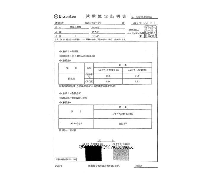 JIS L 1096 A法(恒温法)の保温性検査で弊社比較品より約118%保温性の向上が確認されました。
