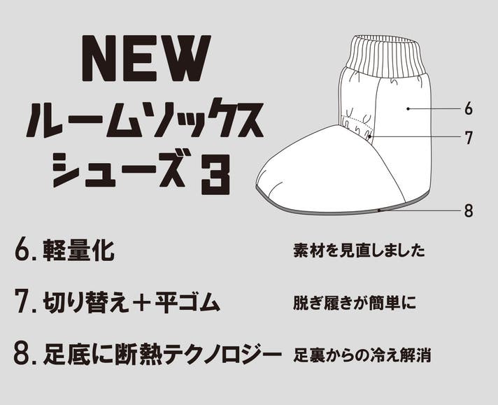 ルームソックスシューズも進化しました。切り替え+平ゴムを採用し、もっと楽に履きやすく動きやすくなりました。