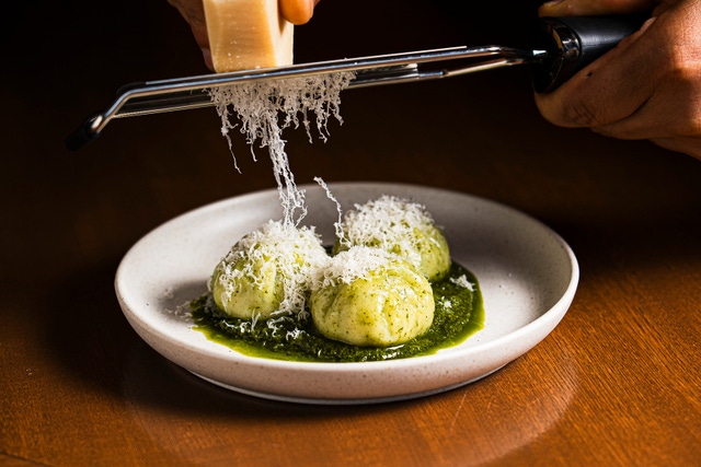 ベジタリアン向けのモモ。じゃがいも、キャベツ、にんにく、しょうが、パクチーなどを皮で包む。合わせるのは、豆乳ベースでパクチーやカルダモンが入ったグリーンのソース。
