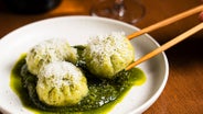 えび、じゃがいも、松の実を皮でつつみ、ジェノベーゼソースをかけてイタリア風に。