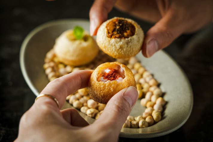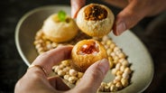 ジャガイモや玉ねぎ、パクチーなど刻んだ野菜が入ったパニプリや、チキンにネパールの山椒ティムルを合わせてピリ辛に仕上げたパニプリ、ヨーグルト、いちご、シナモンとアクセントにチリパウダーを加えた甘辛いパニプリの3種類をご用意しました。
