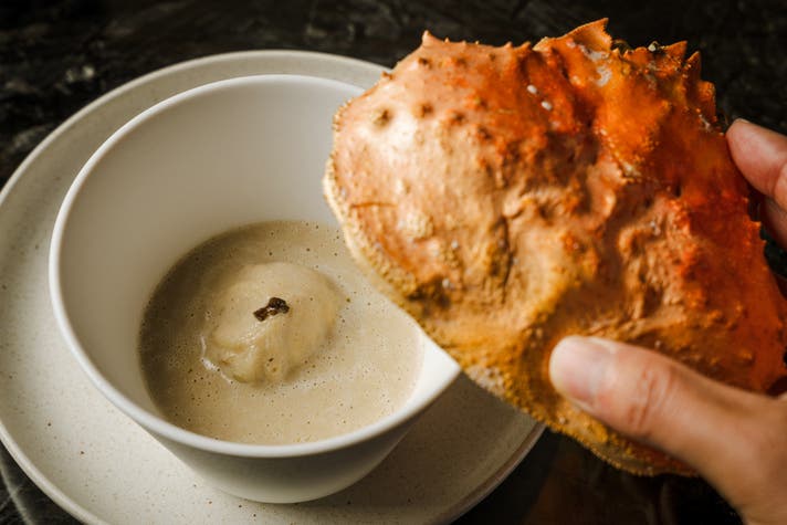 フレンチのコースでいうところの魚料理の立ち位置の“ずわいがにのモモ”は、黒トリュフのクリームスープとともに。