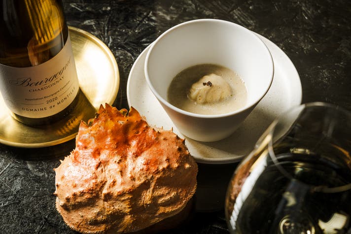 ズワイガニのクリーミーさに合わせるのは、樽が効いたリッチなシャルドネ。