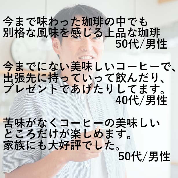 ・酸味もなくて、飲みやすい香も良くて美味しいコーヒーです。お客様に出したり、家族にも嬉しいと思います。また、リピートしたいと思います。/50代女性