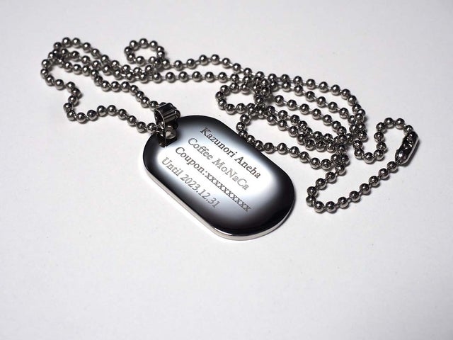 ブルーインパルスの離着陸地点からほど近い場所に焙煎所を構える事にちなみ、クーポンコードをドッグタグにレーザー刻印してお届けします。