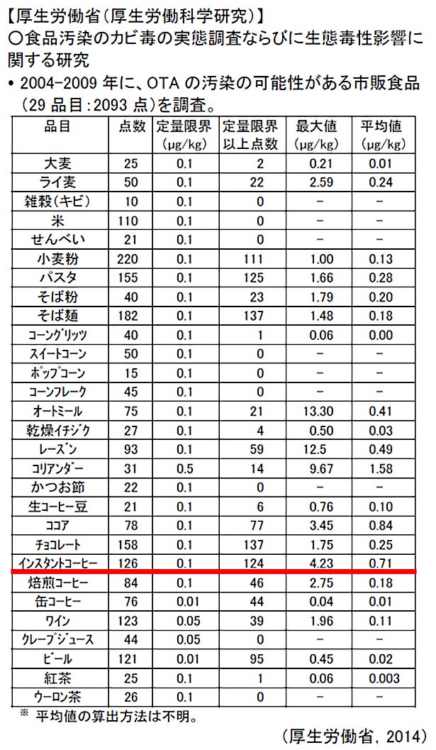 2014年、厚生労働省からある調査結果が発表されました。その調書によると、日本国内で市販されているインスタントコーヒー126品目のうち、124品目からカビを原因とする発がん性の物質が見つかったそうです。