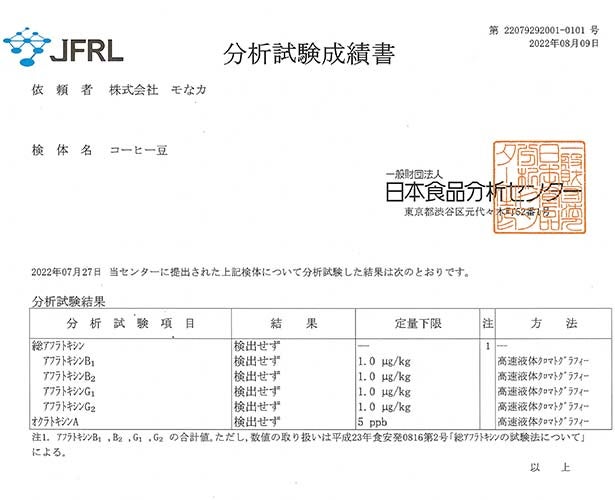 そこで、当時気に入って行きつけにしていたコーヒー店のマスターに事情を話し、そのお店のコーヒーを自腹で日本食品分析センターに持ち込みました。結果、発がん性の物質である「オクラトキシン」と「アフラトキシン」が含まれていないという確認が取れ、それをもっと世の中に拡げようと通販専業のコーヒー店を始めて今に至ります。