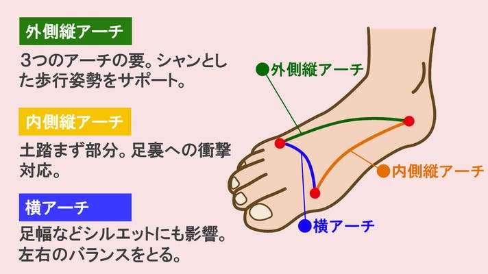 足には3つのアーチがあり、このアーチの形成は2足歩行を行う人間にとって、非常に重要な役割を担っています。