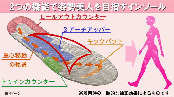 - 骨格ボディメイクの専門家が開発。美ステップインソールが足のアーチと重心移動をサポート。
