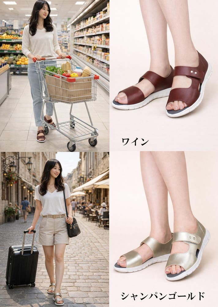 - サンダルを履いてお出かけすするだけ。理想の歩行姿勢で美人を目指す。美姿勢で貴女をキレイに飾る。