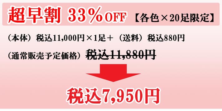 内訳(本体)税込11,000円×1足+(送料)税込880円=(通常販売価格) 税込11,880円の33%OFF。