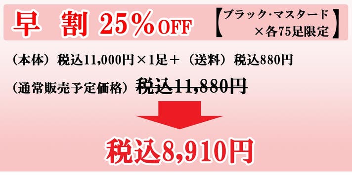 内訳(本体)税込11,000円×1足+(送料)税込880円=(通常販売価格) 税込11,880円の25%OFF。