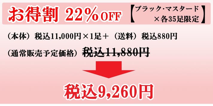 内訳(本体)税込11,000円×1足+(送料)税込880円=(通常販売価格) 税込11,880円の22%OFF。