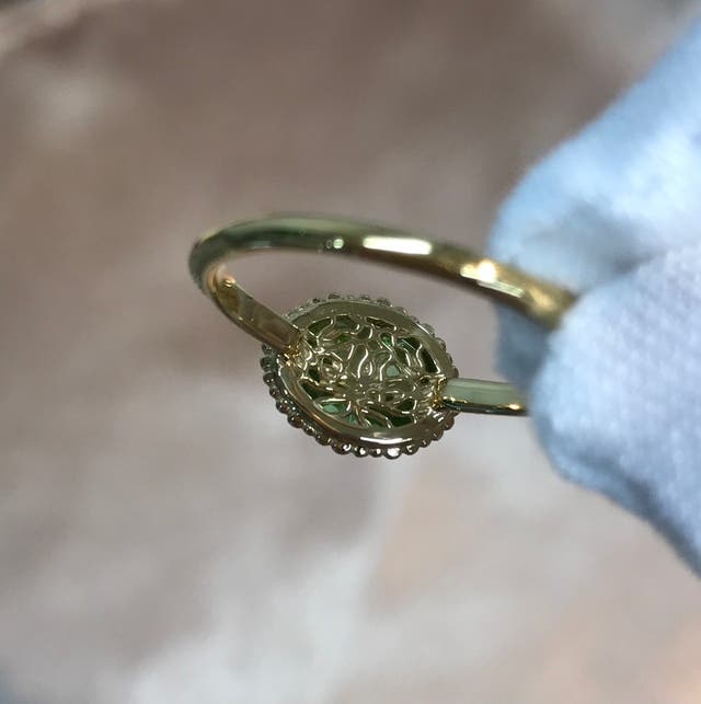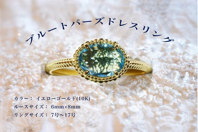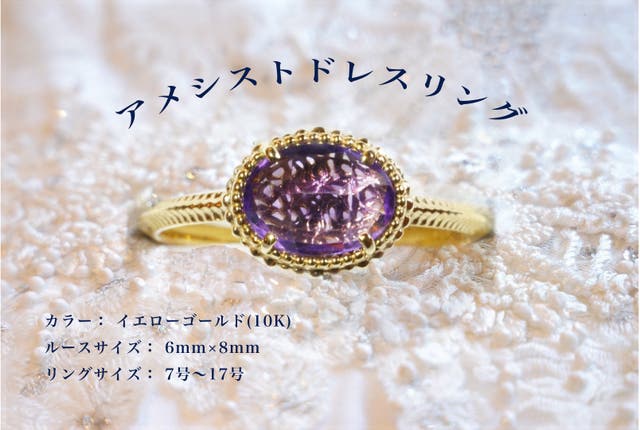 リングの石をセッティングする座の部分にフランスの緻密なリバーレース模様を施しています。そうすることで表からだけでなく裏からも僅かな光を取り込み、色石の美しさを引き立ててくれます。また表から見た時にも【色石の奥に浮かび上がるレース模様】がとても幻想的です。